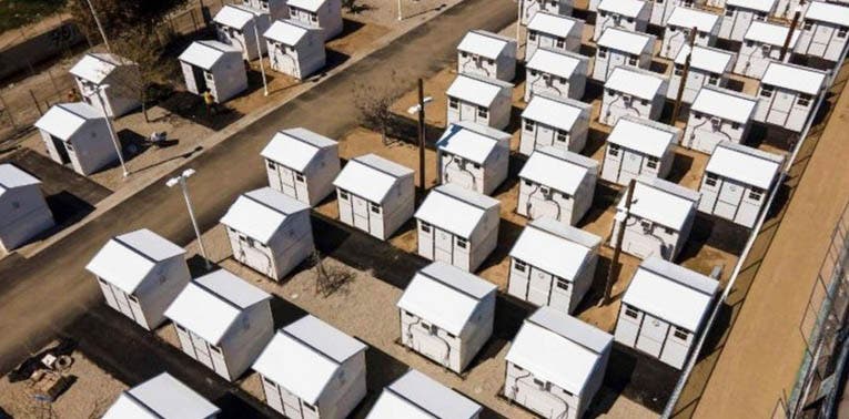 Una aldea de casas prefabricadas en miniatura se instaló en un estacionamiento de Los Ángeles como parte de una iniciativa para ayudar a personas sin hogar a encauzar sus vidas.