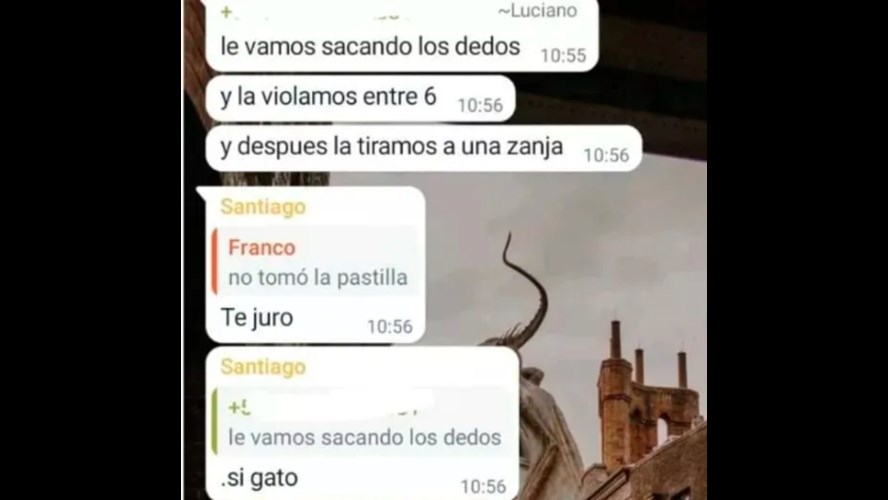 “Vamos a violarle a Lourdes”, escribió uno de los denunciados, que luego fue apoyado por el “sí” de otro. Y un tercer alumno escribe: “le vamos sacando los dedos”, la violamos entre 6, y después la tiramos a una zanja”.