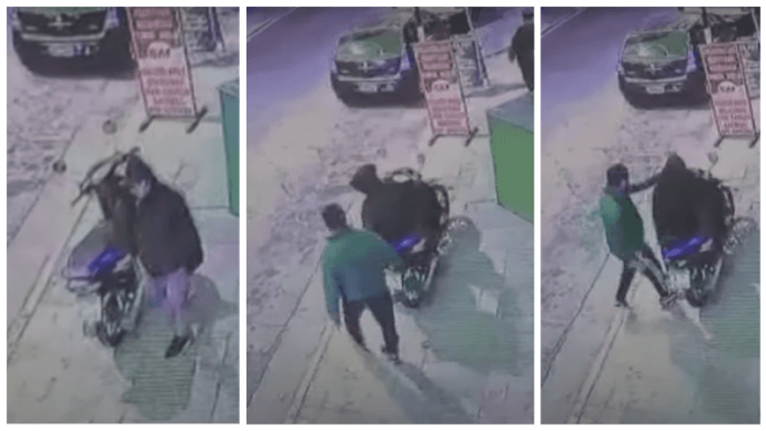 Cuando el taxi se retiró del lugar, el delincuente giró hacia el frente de la moto y comenzó a intentar darle marcha, pero no contaba con que el dueño aparecería en ese instante. Tal y como se ve en el video, el hombre se acercó al ladrón por detrás y le dio un puñetazo en la parte izquierda del rostro.